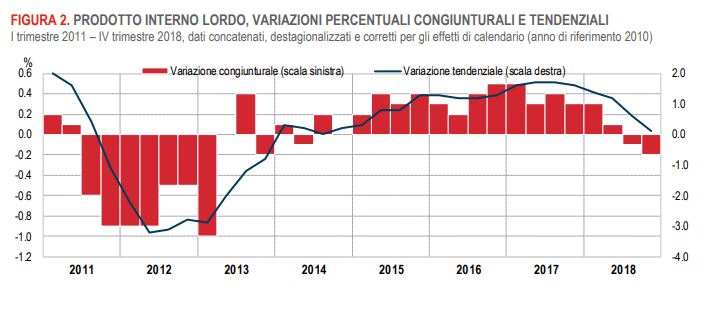 Il 31 gennaio l’Istat ha certificato per l’Italia, con la stima preliminare del Pil dell’ultimo trimestre 2018, la recessione tecnica: il Paese anziché conseguire la crescita del proprio prodotto interno lordo, vede invece i suoi valori scendere per due trimestri consecutivi.