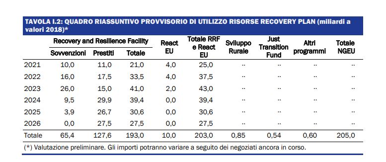 Tra il 2021 ed il 2023 dovrebbe essere utilizzato dall’Italia almeno il 70% delle risorse disponibili, mentre la parte residua sarà utilizzata tra il 2024 ed il 2026.