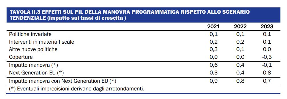 La spinta alla ripresa economica nei primi mesi del 2021 arriverà comunque dalle risorse proprie della legge di bilancio: per il primo anno l’incidenza del Next Generation Eu sulla crescita del Pil è stimata solo intorno allo 0,3%, per il 2022 è previsto lo 0,4% mentre per il 2023 lo 0,8% del Pil.