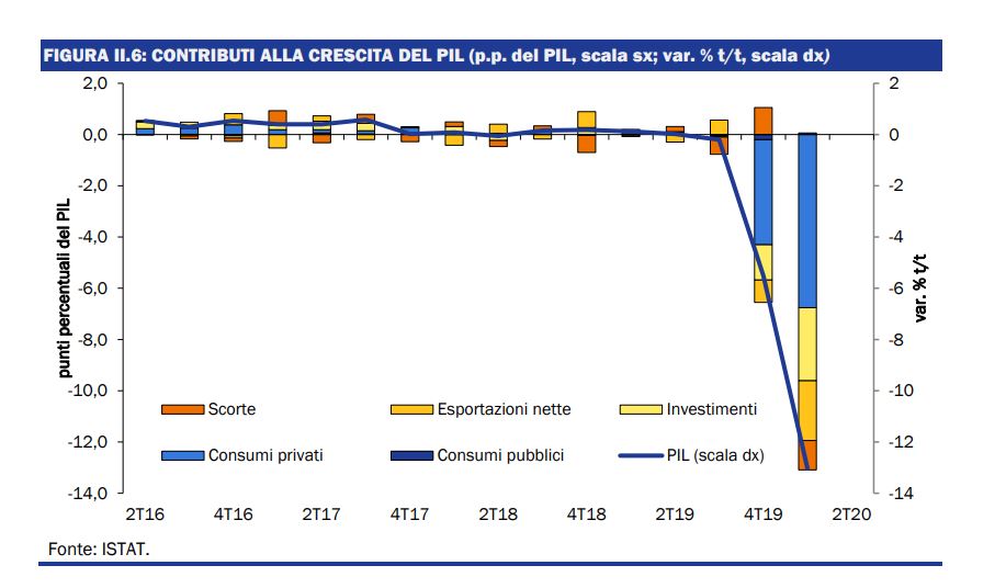 Due sono i punti prospettici previsti dal Ministero dell’Economia: quello normale, con un andamento del Covid19 sotto controllo, che porterà ad una contrazione del Pil per il 2020 del 9% con un “rimbalzo” del 6% per il 2021, e, data l’incertezza, uno scenario avverso (come ipotizzato anche nel Def di aprile 2020) con un possibile peggioramento del quadro sanitario, l’introduzione di una nuova serie di misure precauzionali (meno impattanti, comunque, di quelle adottate nel cuore della pandemia), una correlazione con peggiori sviluppi anche negli altri Paesi, sino all’arrivo di un vaccino per la primavera del 2021. In tale secondo scenario la contrazione del Pil potrà arrivare al 10,5% ed il rimbalzo del 2021 salirà solo fino all’1,8%.