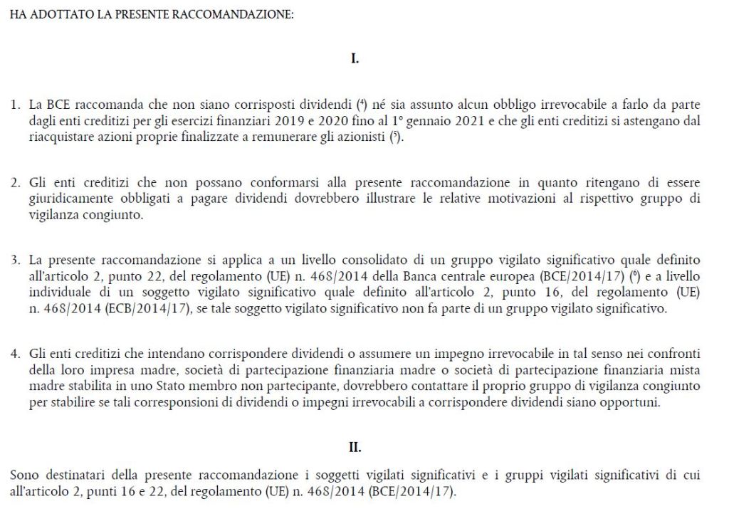 Peraltro la Bce aveva vietato in via cautelativa la distribuzione dei dividendi bancari per gli Istituti posti sotto la sua vigilanza, e tale previsione ha amplificato la situazione di incertezza dal lato dell’offerta: con questa restrizione le banche hanno visto aumentare il loro costo del capitale (direttosi verso altri segmenti finanziariamente più liquidi) ed in un secondo tempo sono state sostanzialmente costrette a rinforzarzi patrimonialmente per fronteggiare possibili future difficoltà.